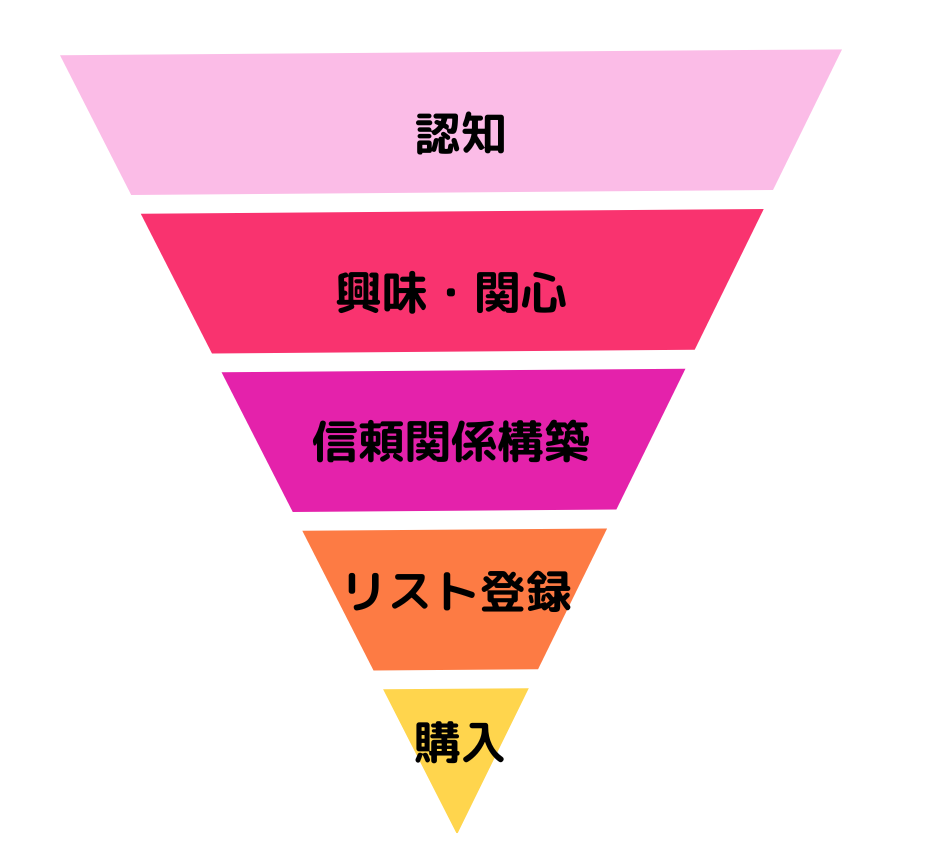 顧客は、潜在顧客からあなたのアカウントを見つけて(認知)フォローし、だんだんと教育された結果あなたの商品を購入します。その段階でどんどんふるいにかけられていくので、顧客になるまでの段階は逆ピラミッド型になります。